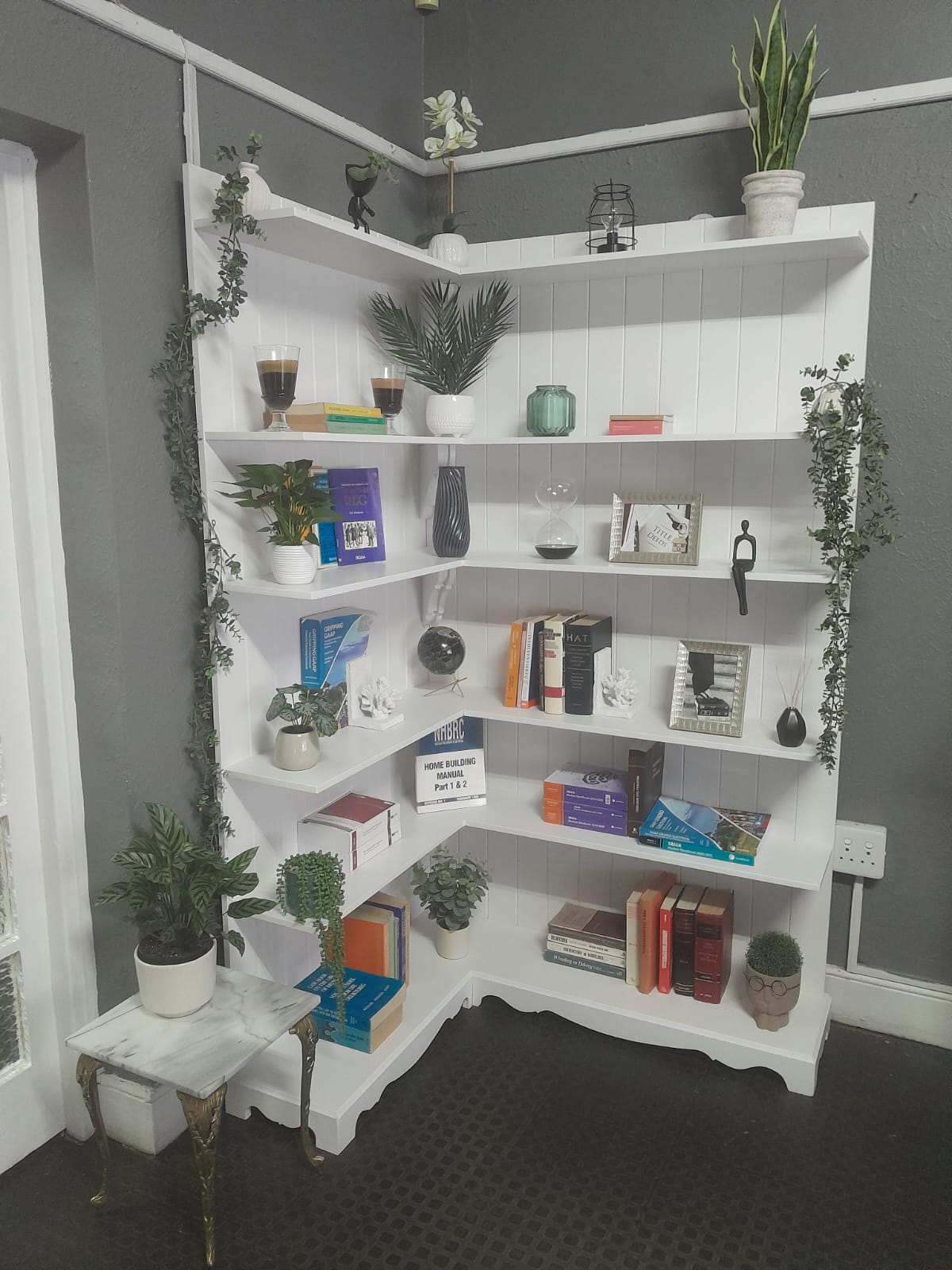 A delighted client hit us up on WhatsApp with a vision for a chic corner shelf that maximizes space and style. We leaped into action and brought this elegant, plant-infused beauty to life – perfect for displaying your favorite books, decor, and greenery